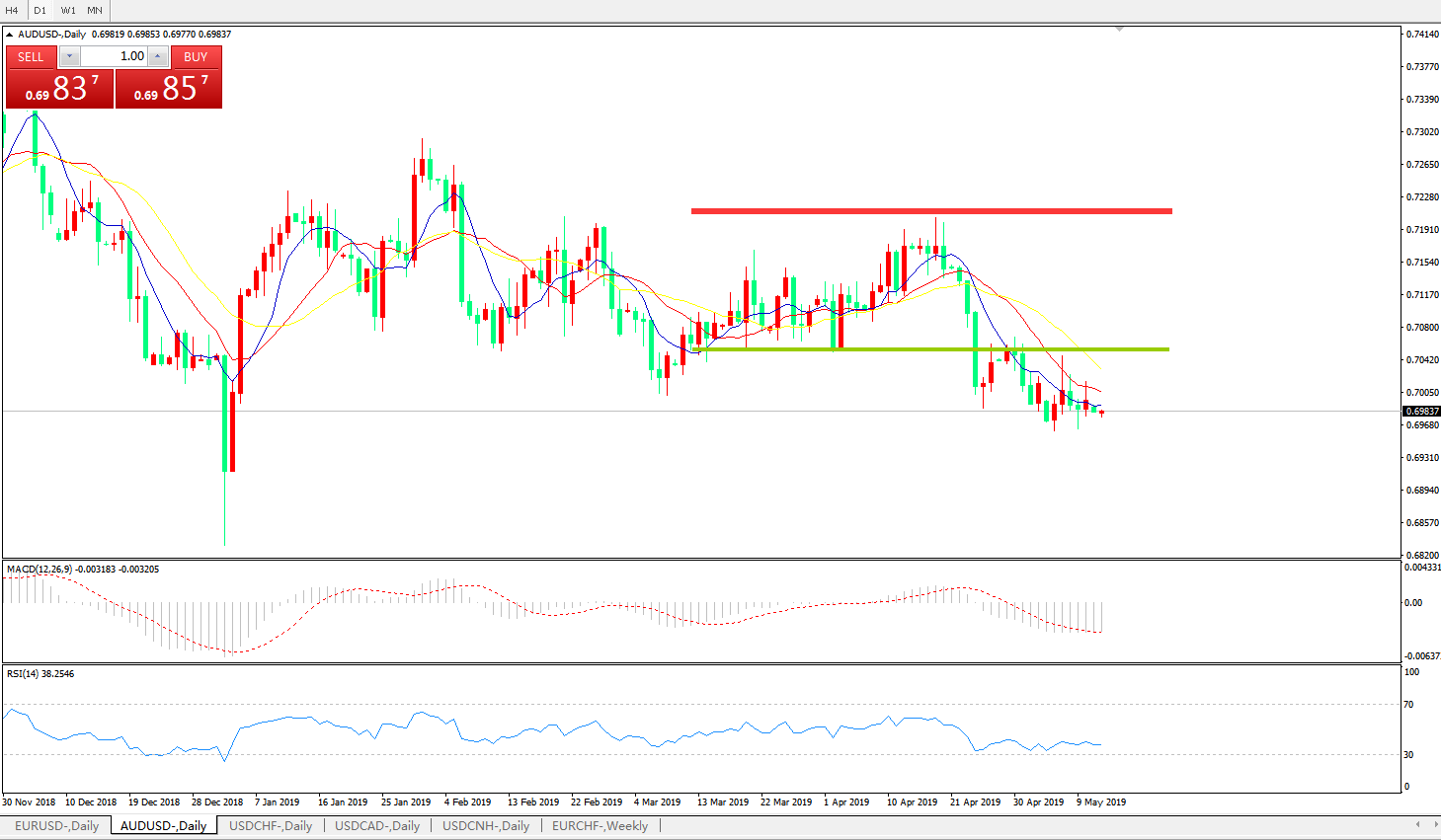 技术面简析:日图均线有序空头排列看跌汇价多空转折区域下方弱势整理MACD下穿0轴且动能柱0轴下方放量,RSI缓步走低预计汇价将进一步下行