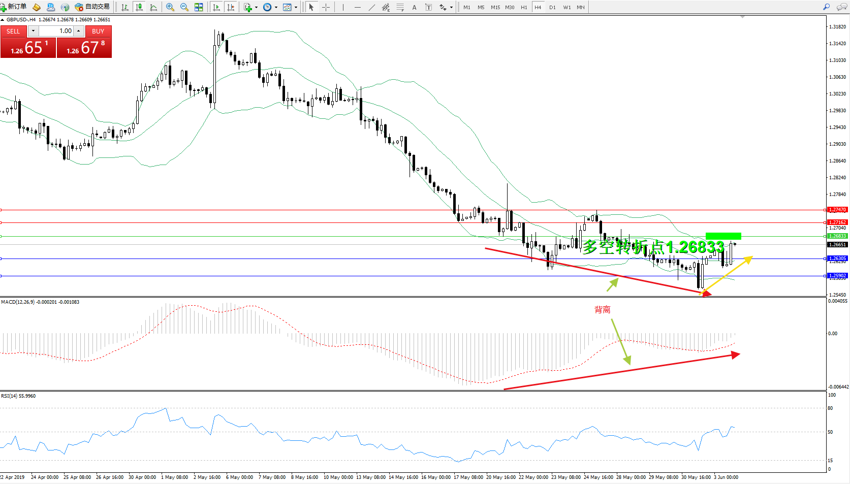 交易策略:1.26833下方看跌,目标1.26305、1.25902