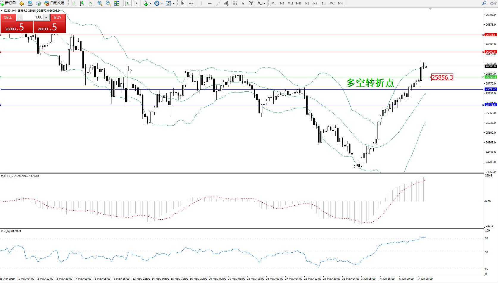 道琼斯指数DJ30—— 4小时K线图显示: