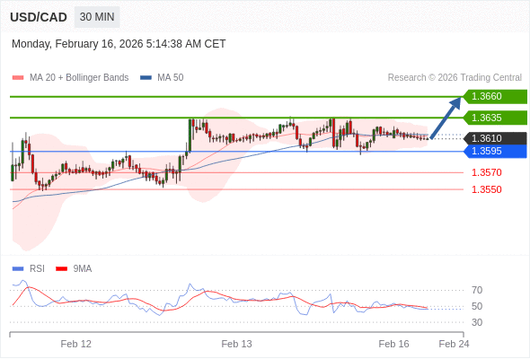 在 1.3595 之上,看涨,目标价位为 1.3635 ,然后为 1.3660 。