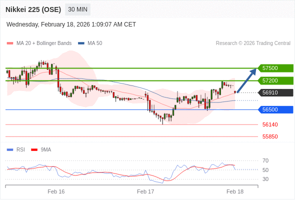 日经225股指期货 (OSE) 当日内: 在56500之上,看涨。