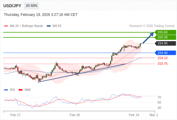 在 154.40 之上,看涨,目标价位为 155.30 ,然后为 155.60 。