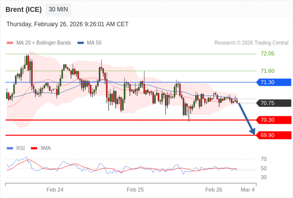 在 71.30 之下,看跌,目标价位为 70.30 ,然后为 69.90 。