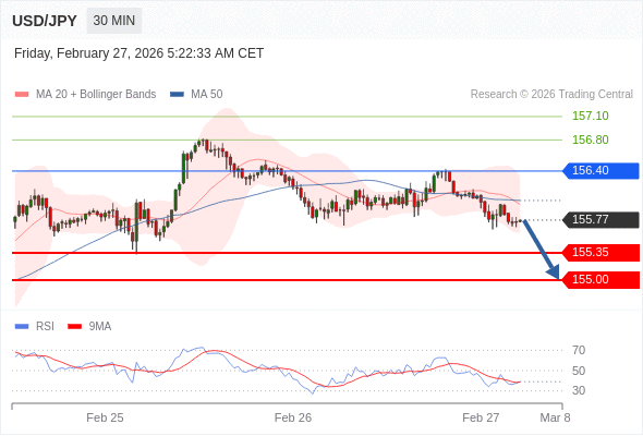 交易策略: 在 156.40 之下,看跌,目标价位为 155.35 ,然后为 155.00 。