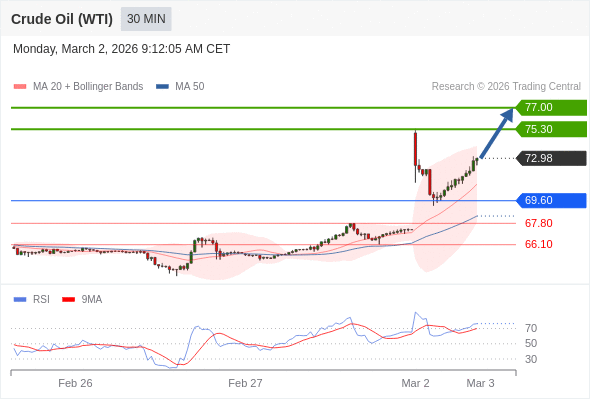在 69.60 之上,看涨,目标价位为 75.30 ,然后为 77.00 。