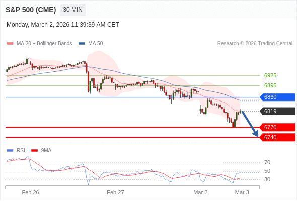 美国标普500指数期货 (H6) 当日内: 短期关键阻力位在6860。