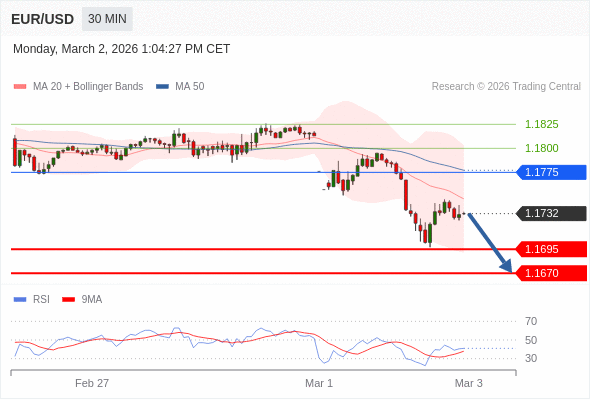 在 1.1775 之下,看跌,目标价位为 1.1695 ,然后为 1.1670 。