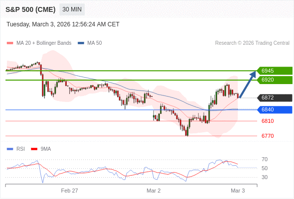 美国标普500指数期货 (H6) 当日内: 在6840之上,看涨。
