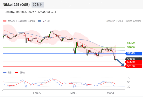 在 57315 之下,看跌,目标价位为 56540 ,然后为 56150 。