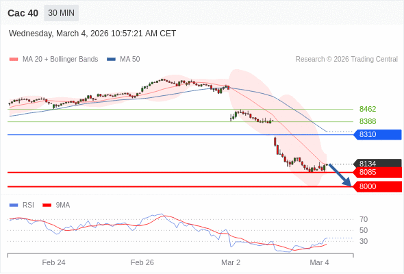 Cac 40 当日内: 短期关键阻力位在8310。