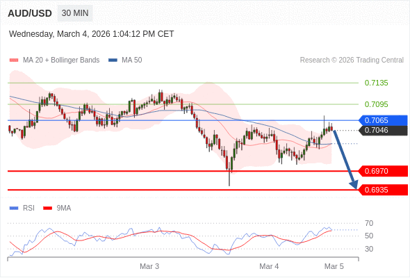 交易策略: 在 0.7065 之下,看跌,目标价位为 0.6970 ,然后为 0.6935 。