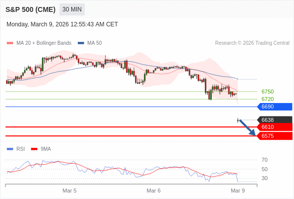 美国标普500指数期货 (H6) 当日内: 存在压力。