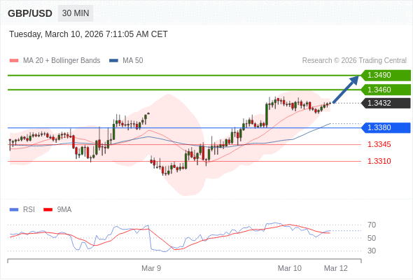 在 1.3380 之上,看涨,目标价位为 1.3460 ,然后为 1.3490 。