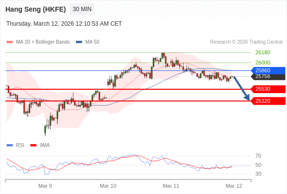 香港恒生指数期货 当日内: 朝25530运行。