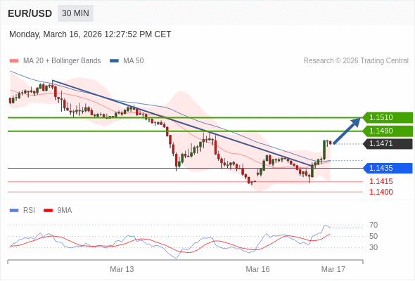 欧元/美元 当日内: 持续上升。