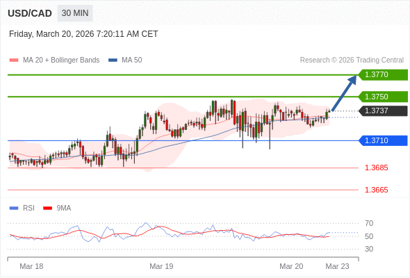 在 1.3710 之上,看涨,目标价位为 1.3750 ,然后为 1.3770 。