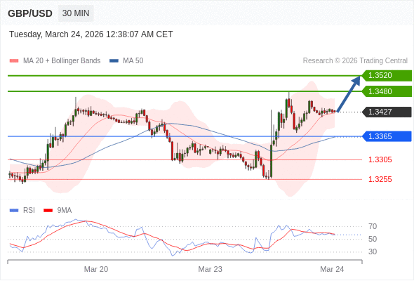在 1.3365 之上,看涨,目标价位为 1.3480 ,然后为 1.3520 。