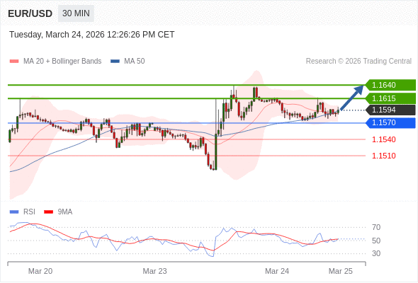 在 1.1570 之上,看涨,目标价位为 1.1615 ,然后为 1.1640 。
