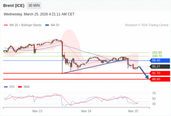 布伦特原油 (ICE) (M6) 当日内: 目标位为91.70。