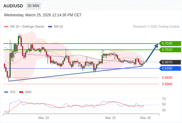 在 0.6950 之上,看涨,目标价位为 0.7010 ,然后为 0.7030 。