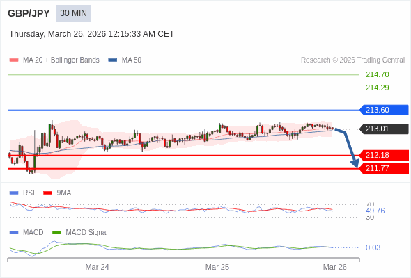 交易策略: 逐渐下跌,当 213.60 阻碍上行,则 211.77 为目标位。