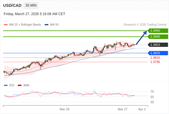 在 1.3825 之上,看涨,目标价位为 1.3880 ,然后为 1.3900 。