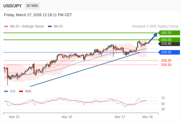 在 159.55 之上,看涨,目标价位为 160.00 ,然后为 160.25 。