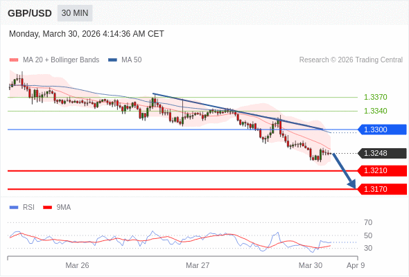 交易策略: 在 1.3300 之下,看跌,目标价位为 1.3210 ,然后为 1.3170 。