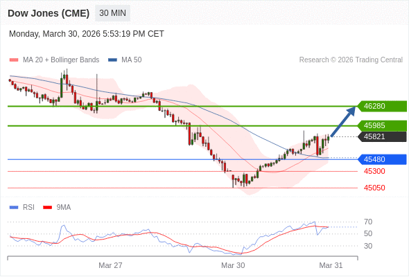 在 45480 之上,看涨,目标价位为 45985 ,然后为 46280 。