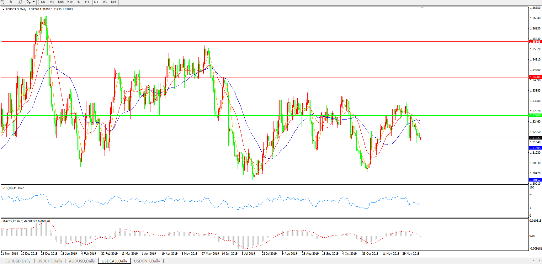 技术面简析:日线图均线再度呈空头排列,汇价震荡中偏弱运行,MACD在0轴上方持续走弱逼近0轴且量能0轴下方放量,RSI震荡走低,短期汇价需关注1.3140附近支撑,预计汇价存进一步下行空间。