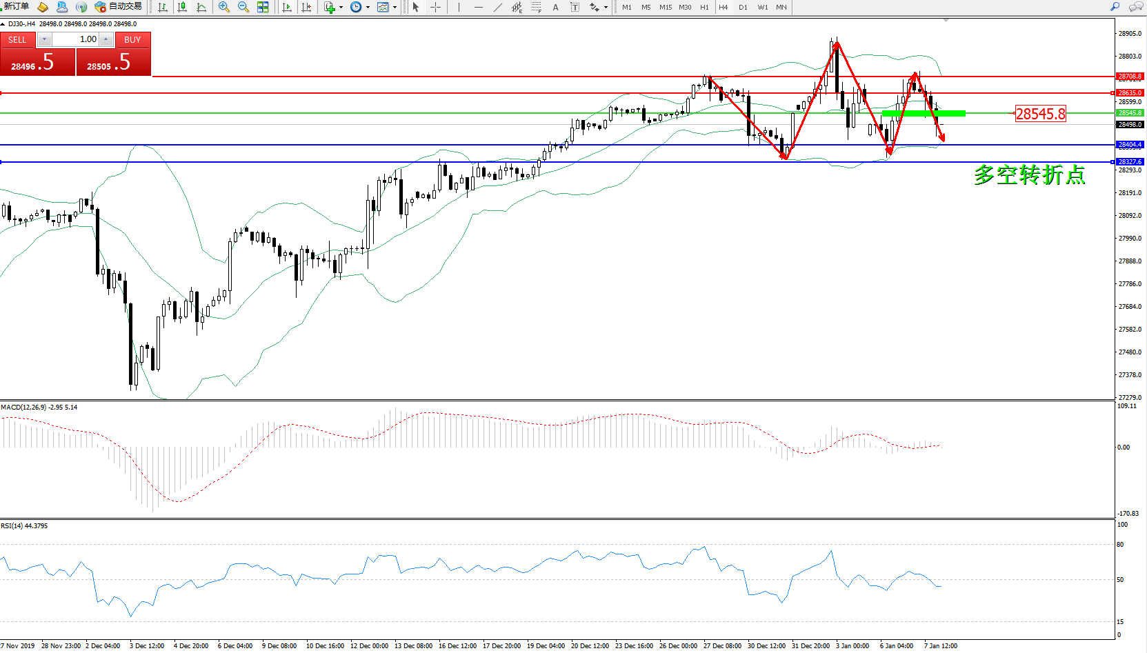 道琼斯指数DJ30—— 4小时K线图显示: