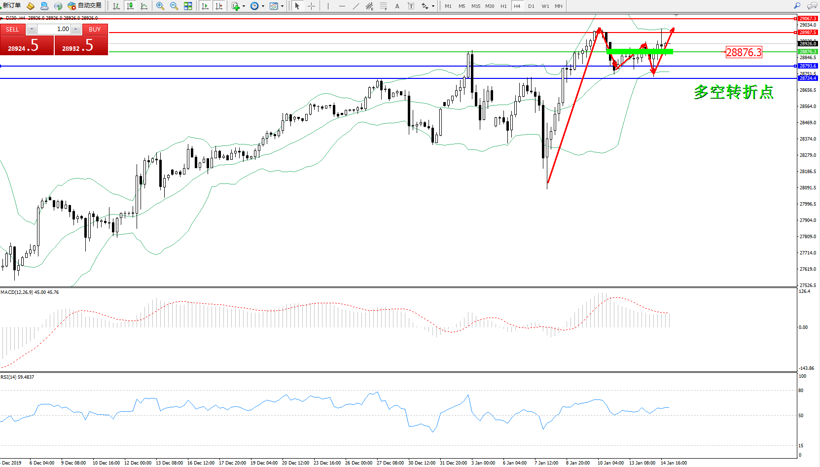 道琼斯指数DJ30—— 4小时K线图显示: