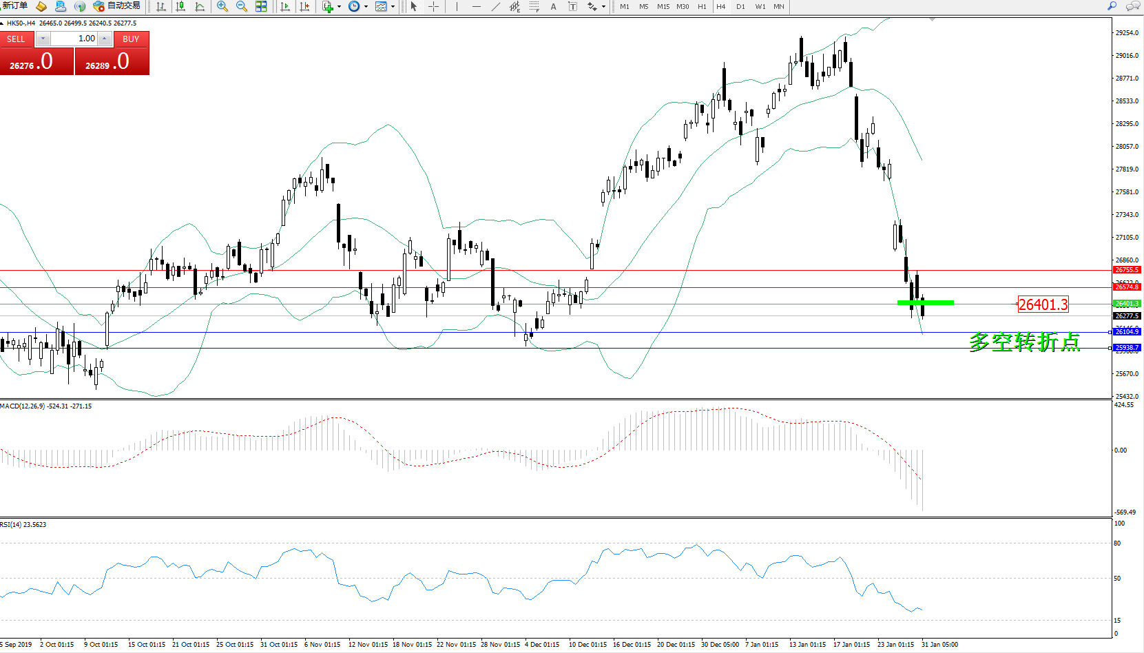 恒指HK50 ——4小时K线图显示: