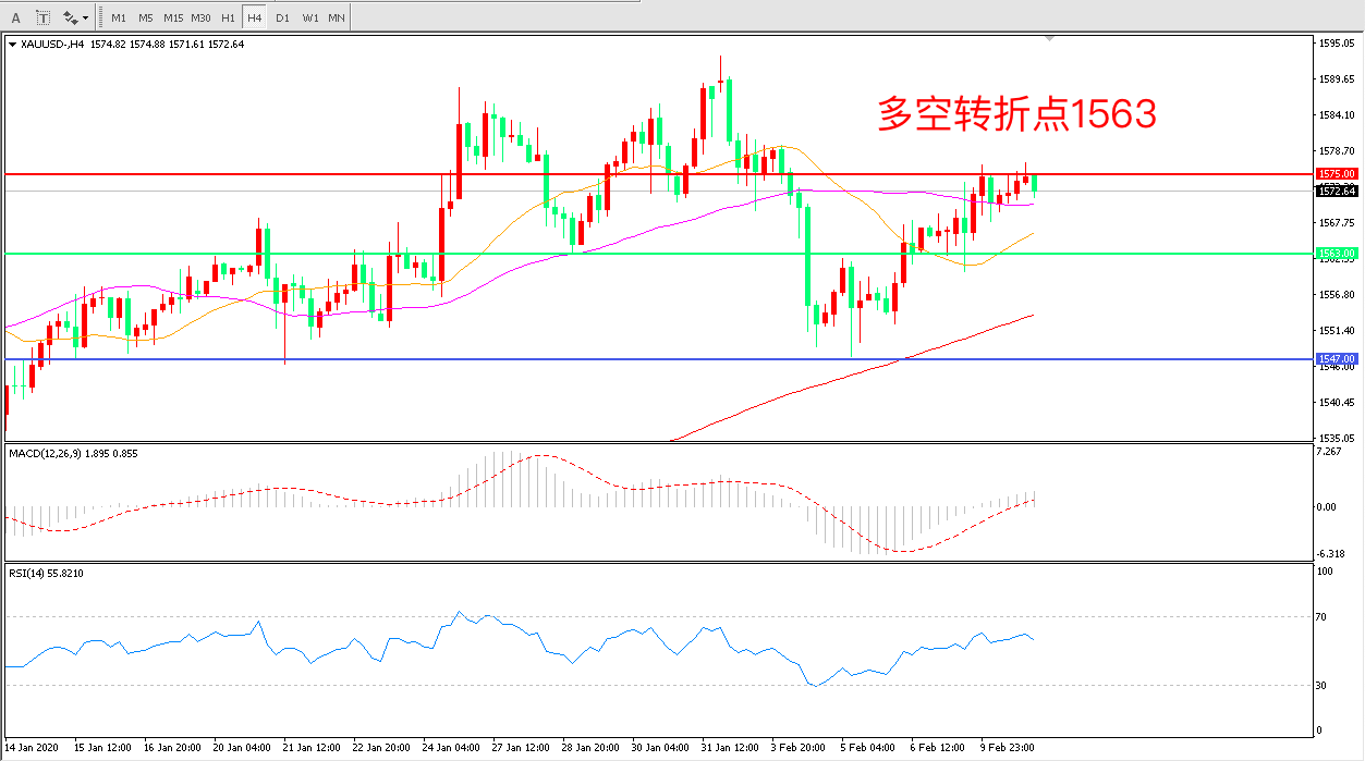 4小时图看,金价触碰1575一线小幅回落涨势暂缓,均线系统走平, MACD红柱增加RSI指标走平,近期延续上行概率较大。