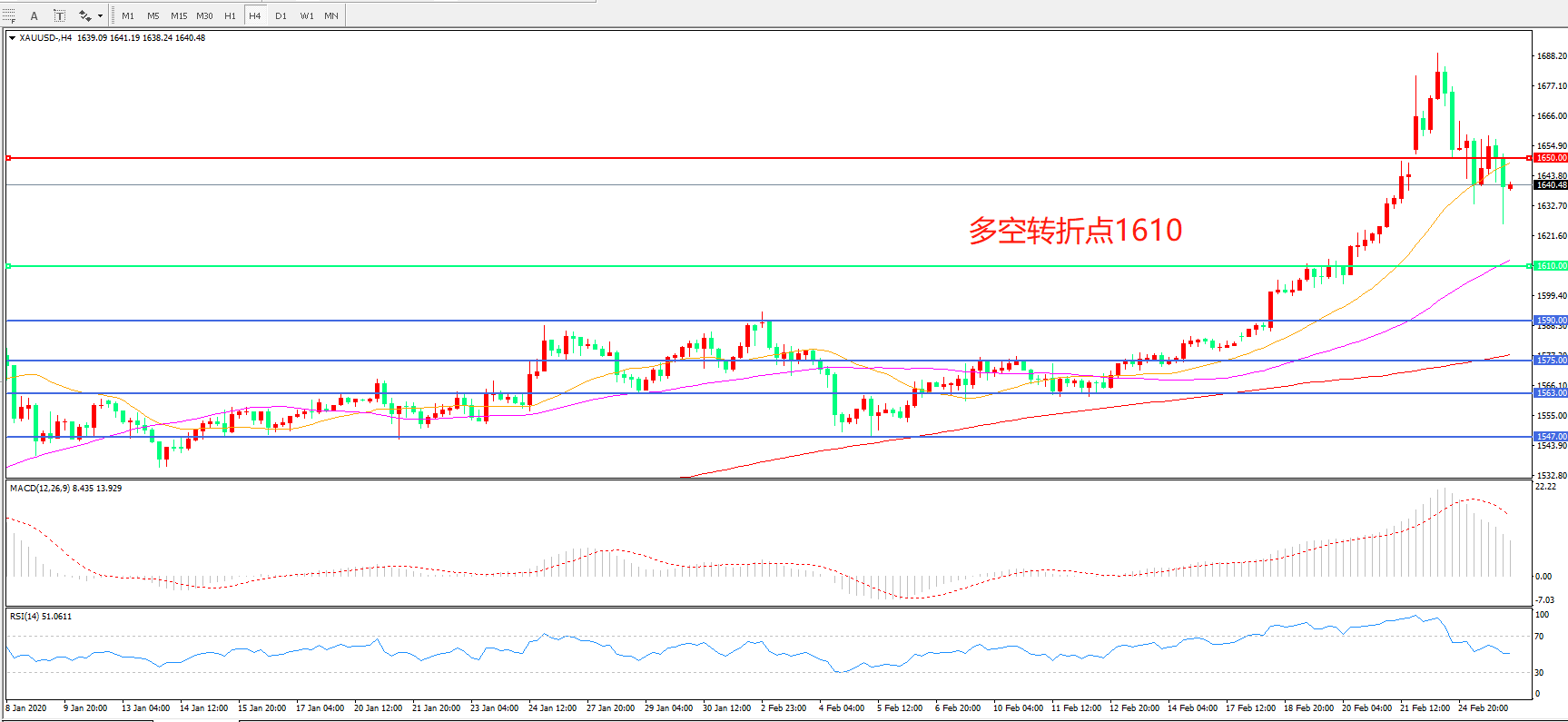 备选策略:在1610.00之下看跌,目标1650.00 1700.00