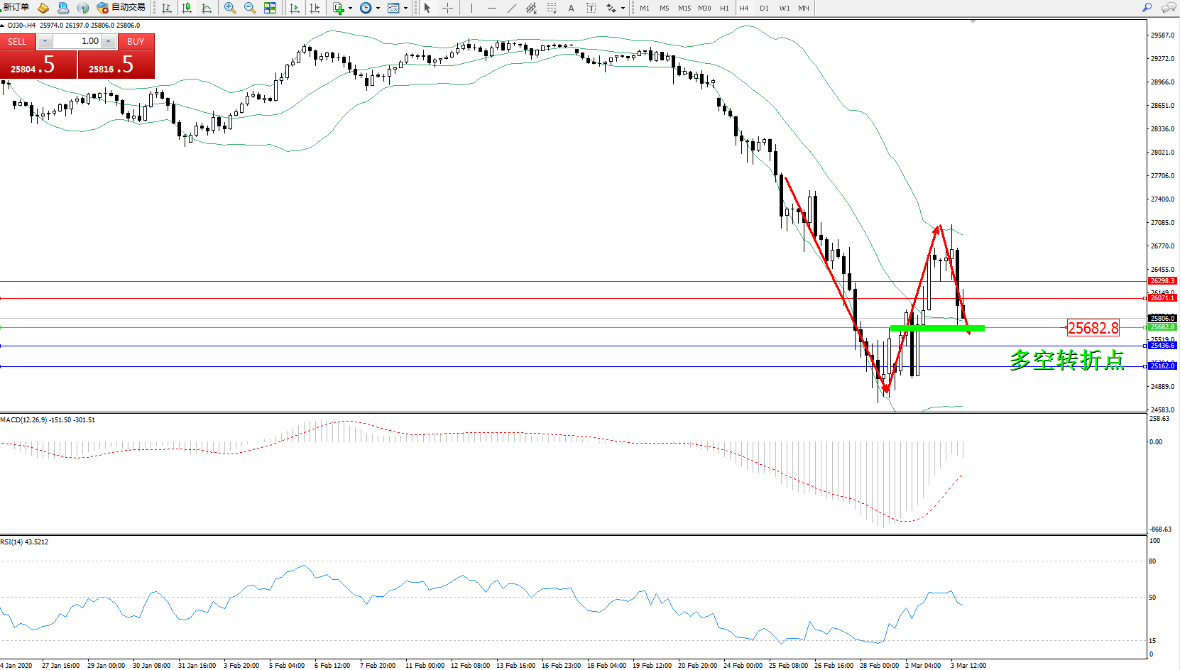 道琼斯指数DJ30—— 4小时K线图显示: