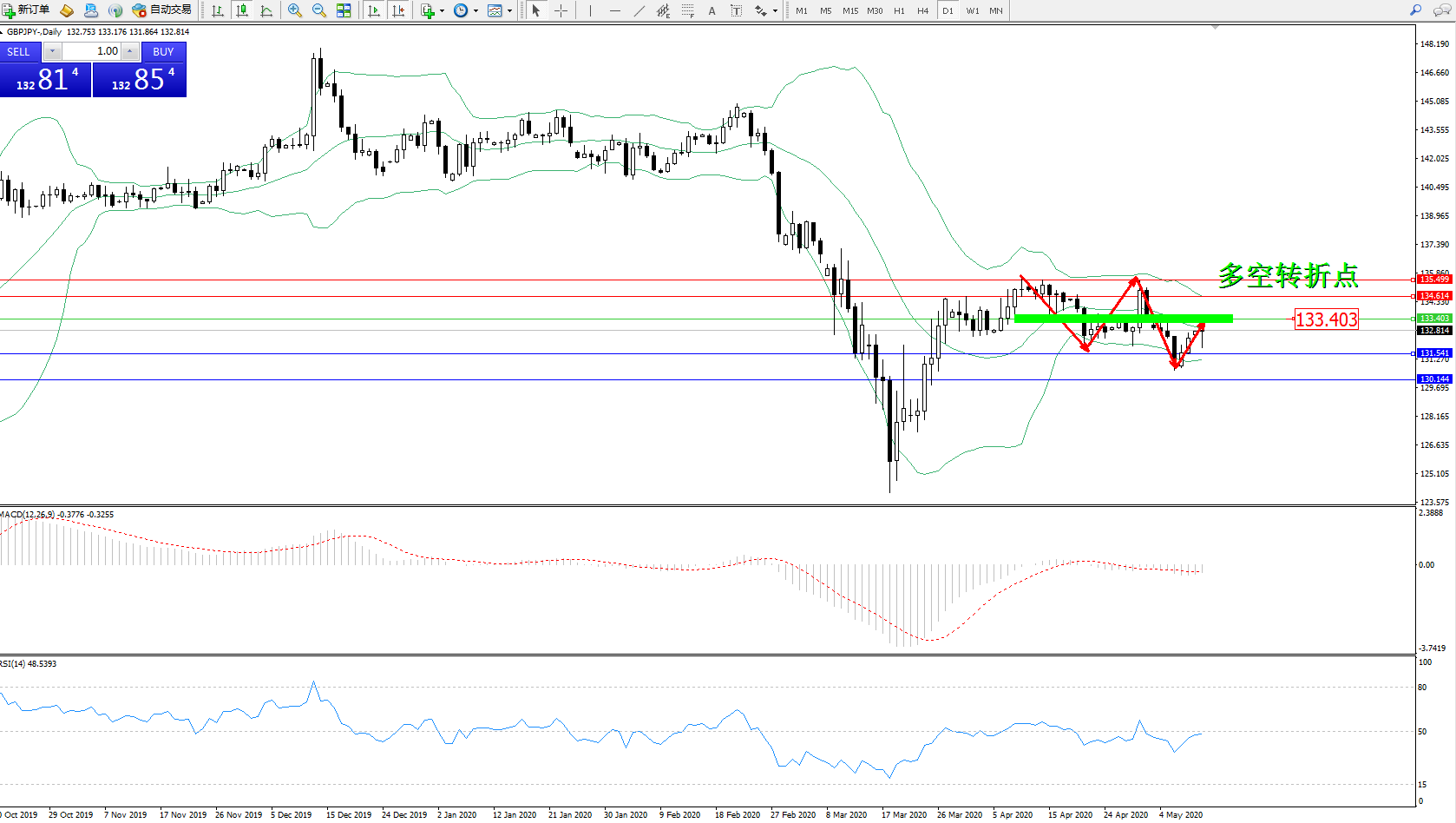 交易策略:133.403下方看跌,目标131.541130.144