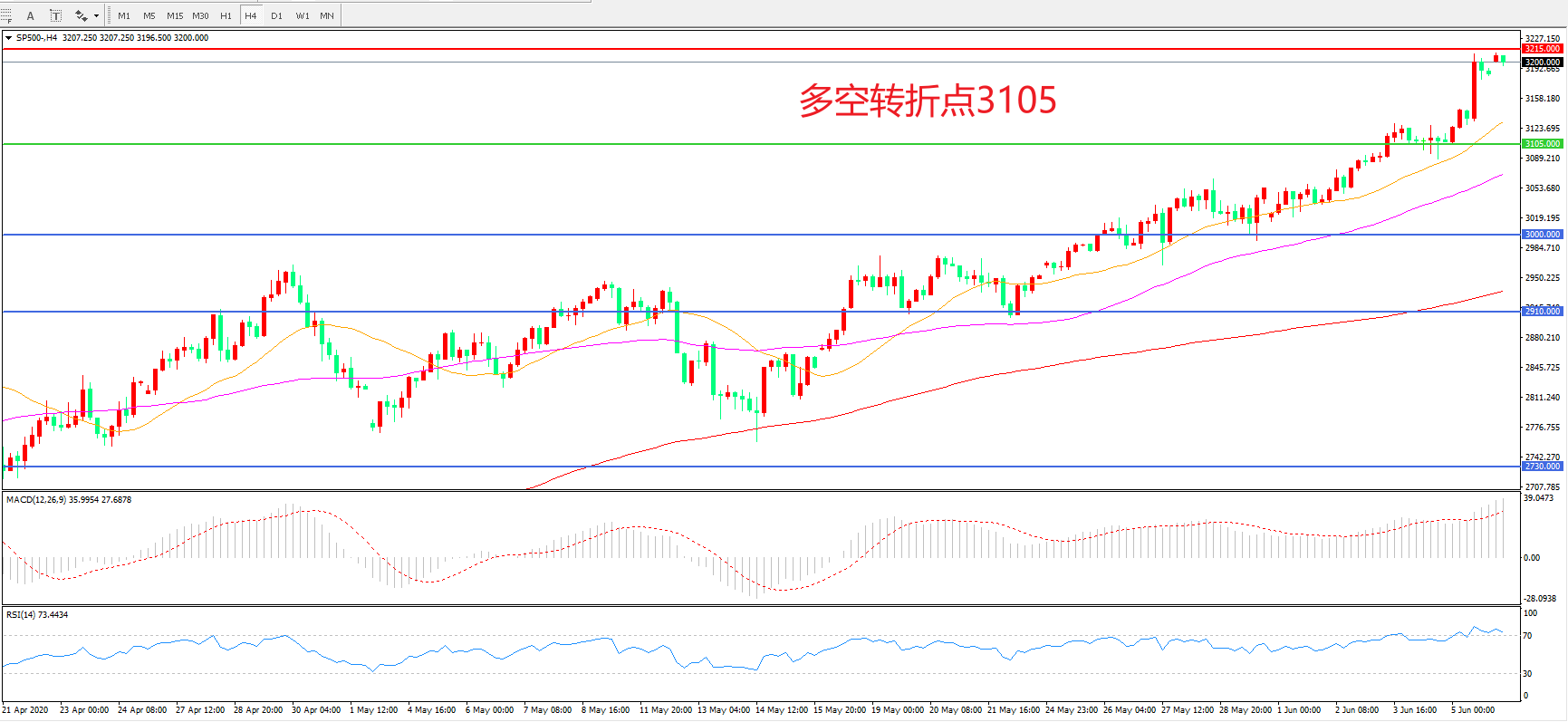 4小时图看,标普500长阳拉升,整体表现十分强势,均线系统呈多头排列,MACD红柱增加,RSI指标走平,日内延续上行概率较大。