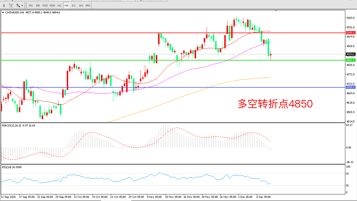 4小时图看,沪深300位震荡后大幅下挫短期表现低迷4850成为短线支撑55周期均线成为上方阻力均线系统走平MACD红柱减少绿柱增加RSI指标向上,日内延续震荡概率较大。