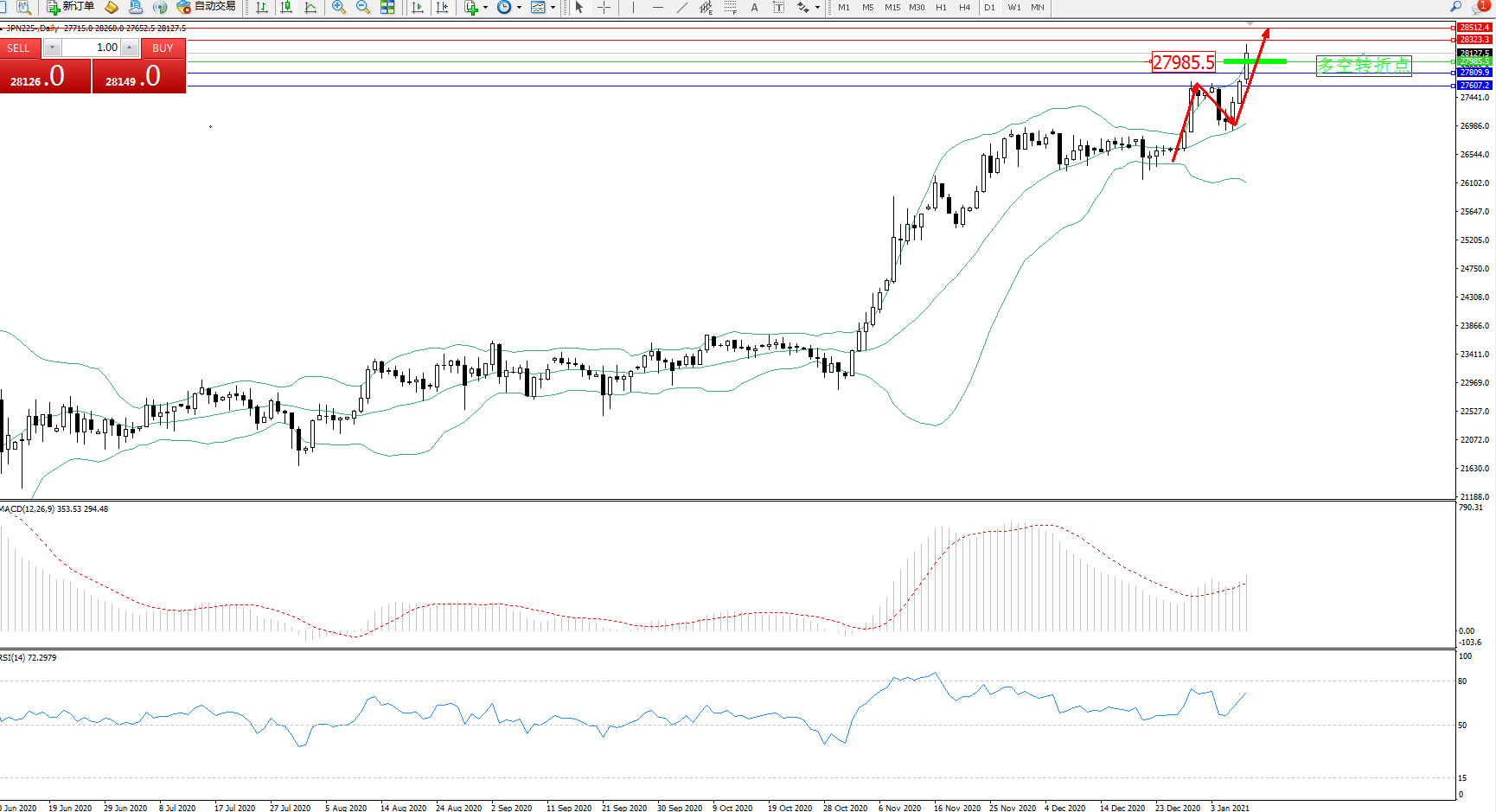 日经225指数1月8日(周五)收盘上涨629.87点,涨幅2.29%,报28120.00点。日本11月所有家庭支出意外连续第二个月上升,因消费者信心显现出从疫情引发的损害中进一步恢复的迹象。11月所有家庭支出较上年同期上升1.1%,优于下滑1.5%的预估中值。这也是继10月的上升1.9%后连续第二个月扩张。11月家庭支出较前月下降1.8%。疫情复燃打击对旅游等服务的需求。日本官员表示,有必要关注疫情复燃对支出趋势的影响,以及11月支出同比升幅小于前月的情况。由于受到新冠疫情的沉重打击,而且政府在2019年10月上调了消费税,去年大多时间家庭支出已然承压。最新数据可能让决策者的压力有所缓解,他们面对着克服疫情危机、实现政府增长目标的挑战。据日本共同社:日本东京新增2300例新冠肺炎确诊病例。兵库县新增297例新冠肺炎确诊病例。