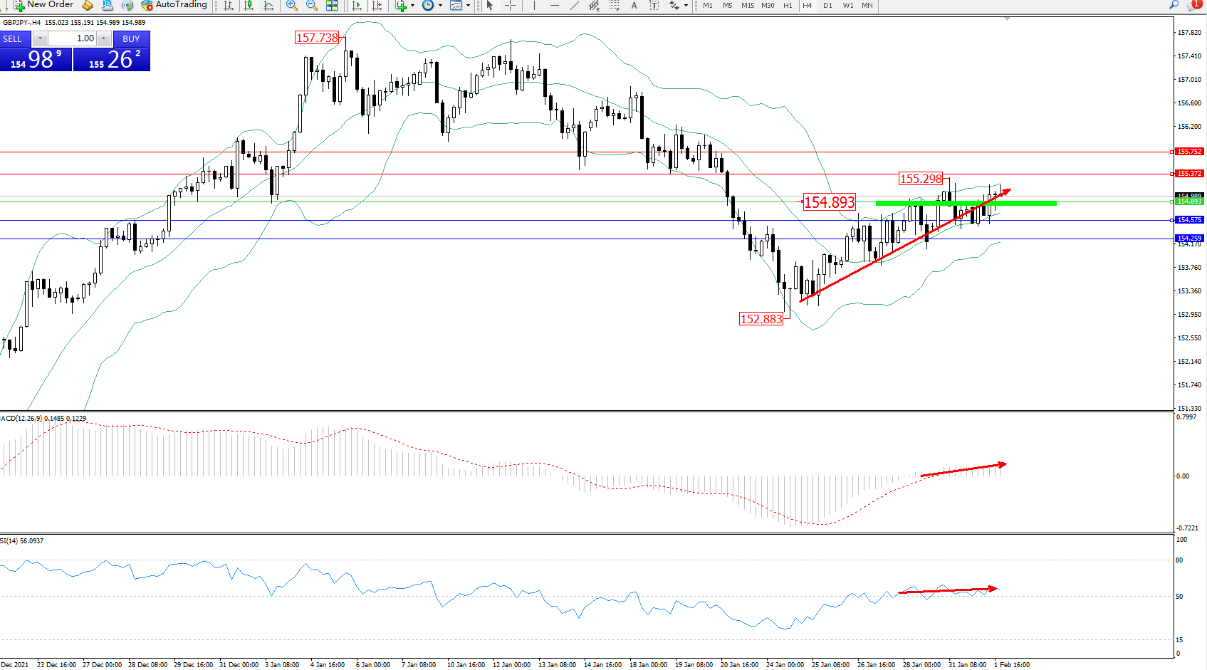 交易策略:154.893上方看涨,目标155.372、155.752