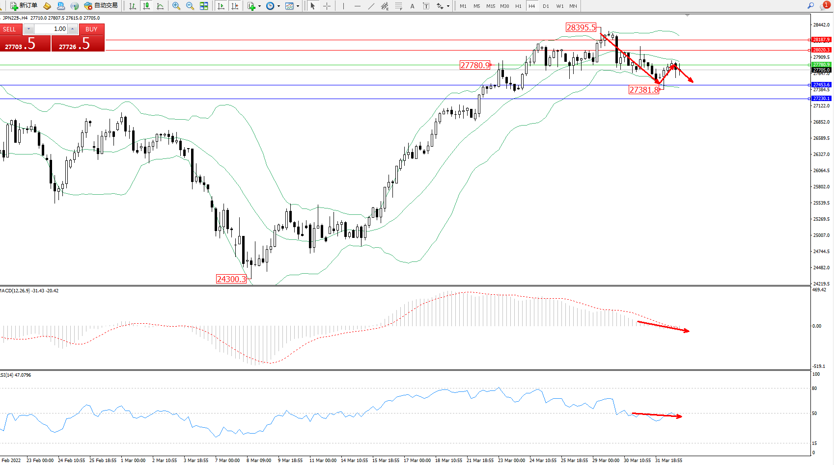 日经指数JPN225——4小时K线图显示: