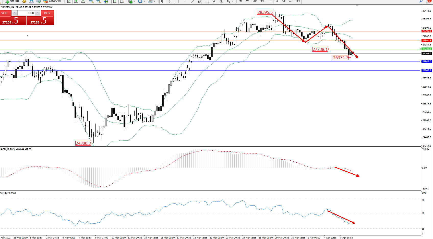 日经指数JPN225——4小时K线图显示: