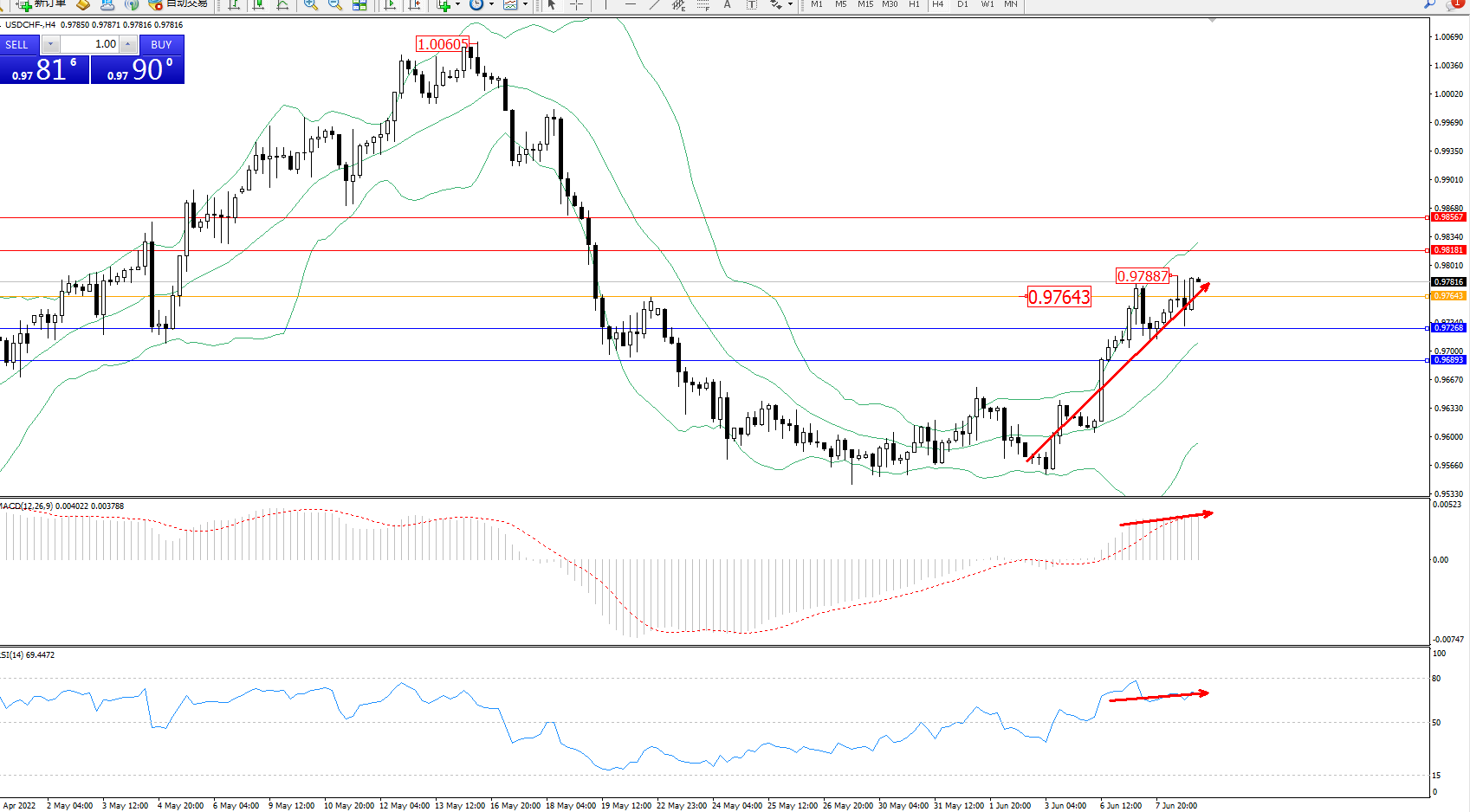 美元瑞郎USDCHF——4小时K线图显示: