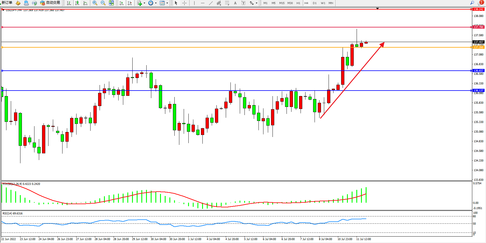 交易策略:137.260上方看涨,目标137.780、138.242