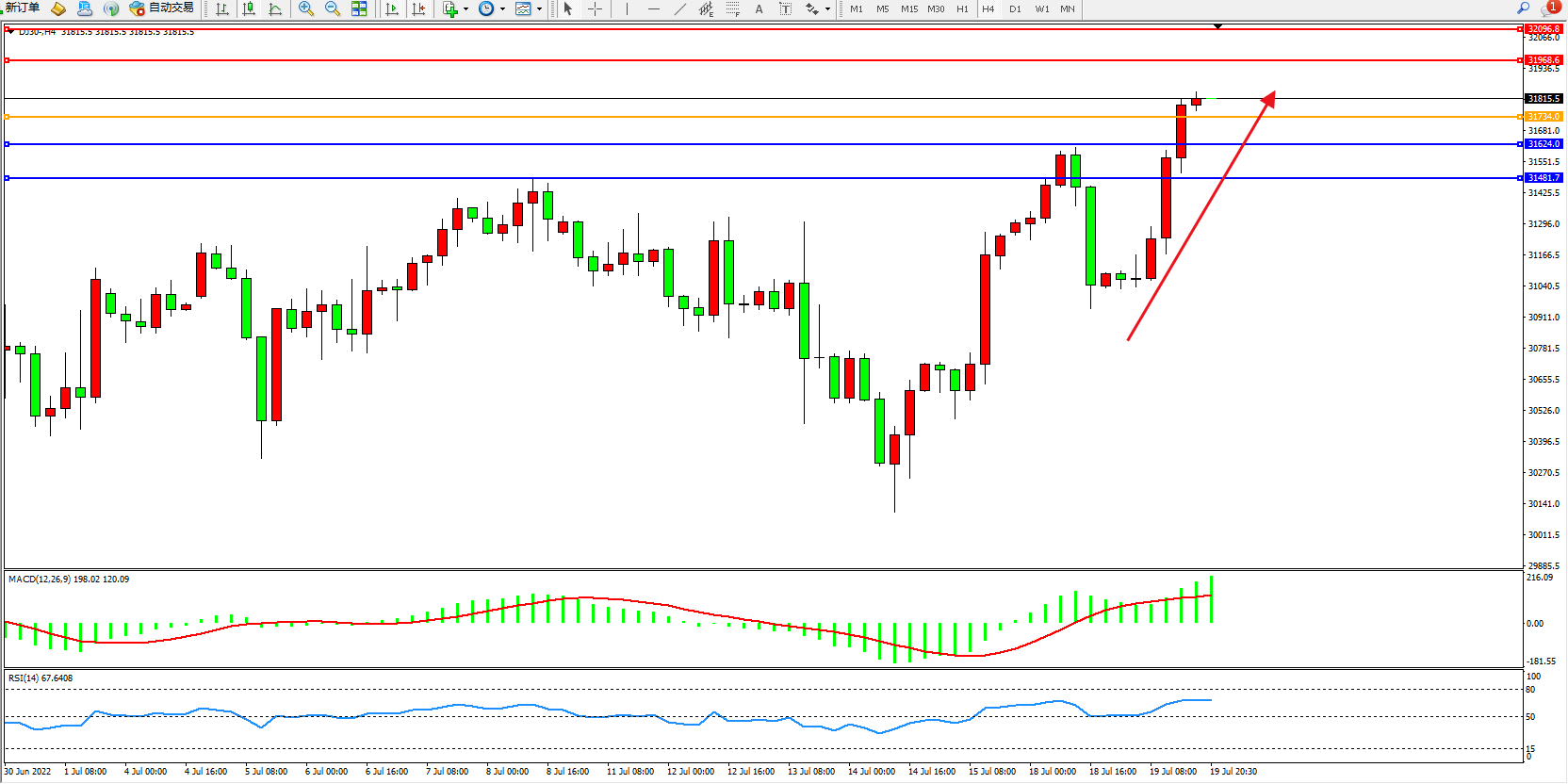 道琼斯指数DJ30——4小时K线图显示: