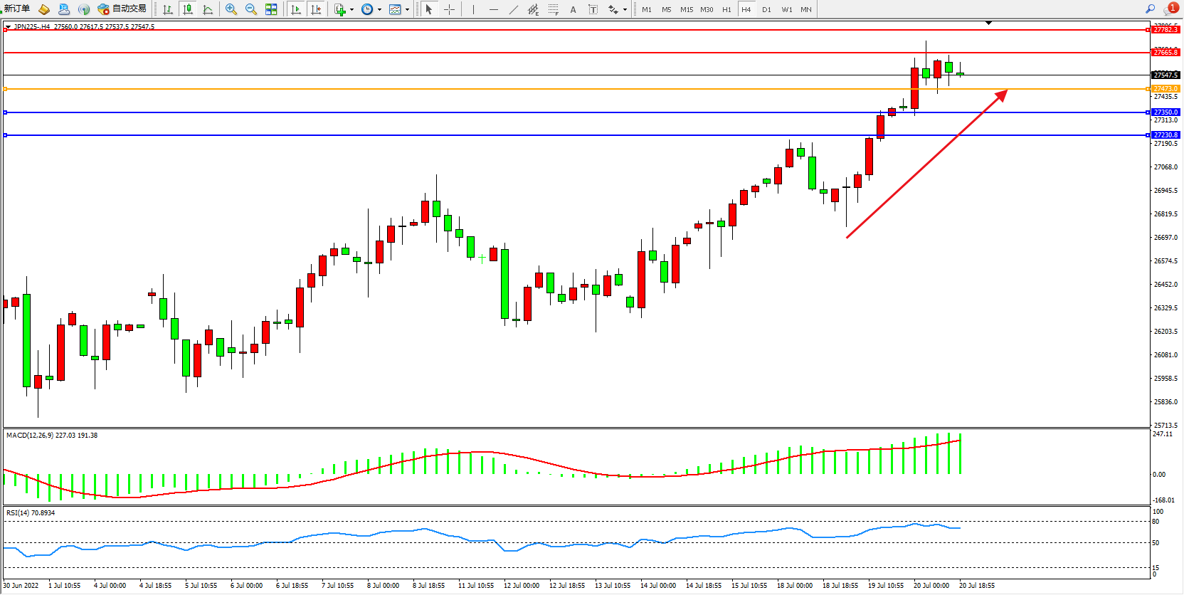 日经指数JPN225——4小时K线图显示: