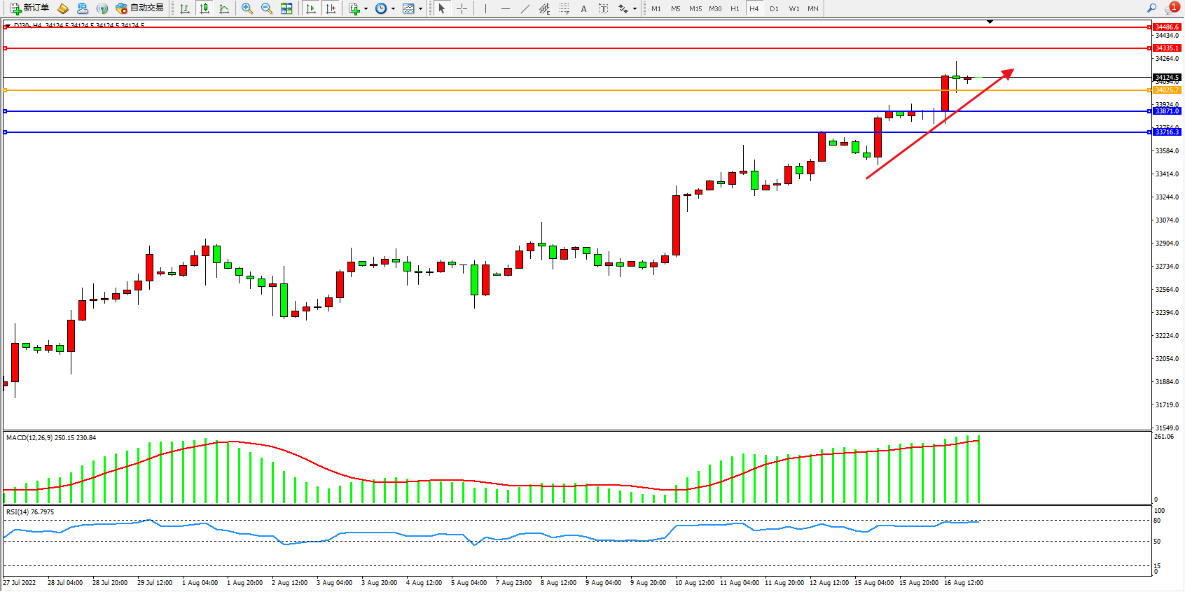 道琼斯指数DJ30——4小时K线图显示: