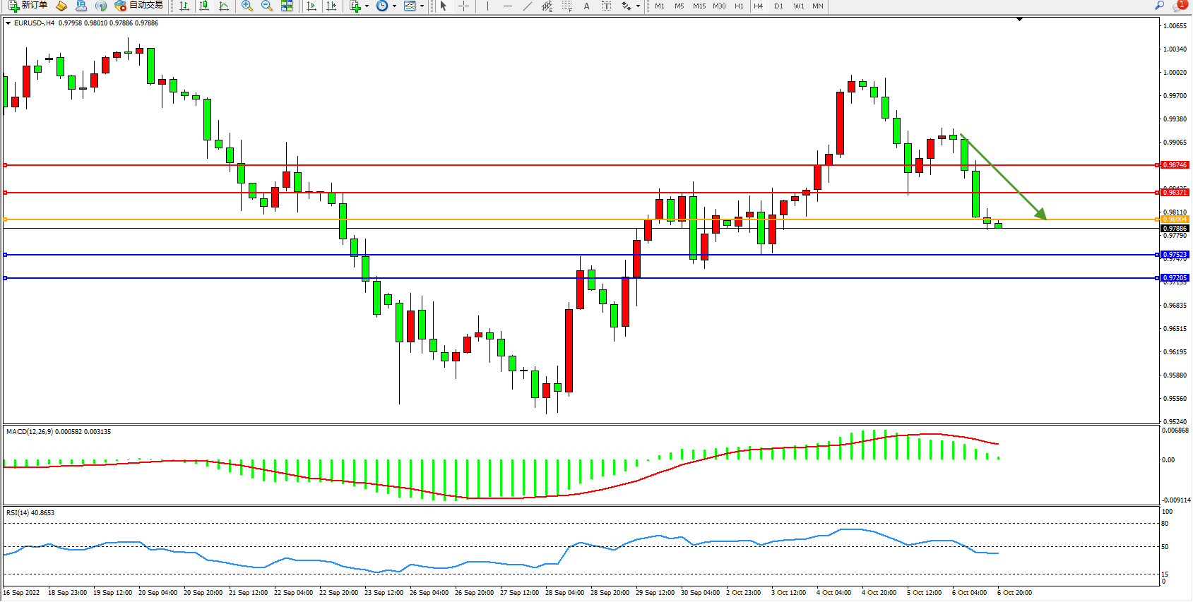 欧元美元EURUSD—4小时K线图显示: