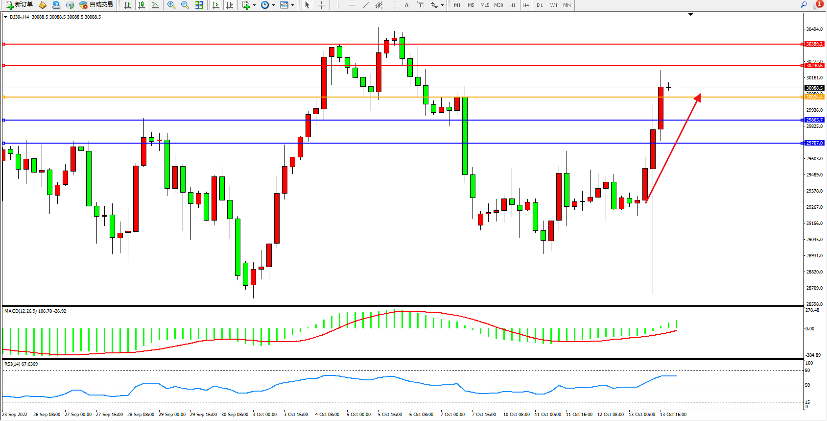 道琼斯指数DJ30——4小时K线图显示: